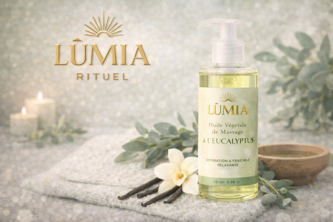 Huile Végétale de Massage à l’Eucalyptus LUMIA™ – Hydratation & Fraîcheur Relaxante