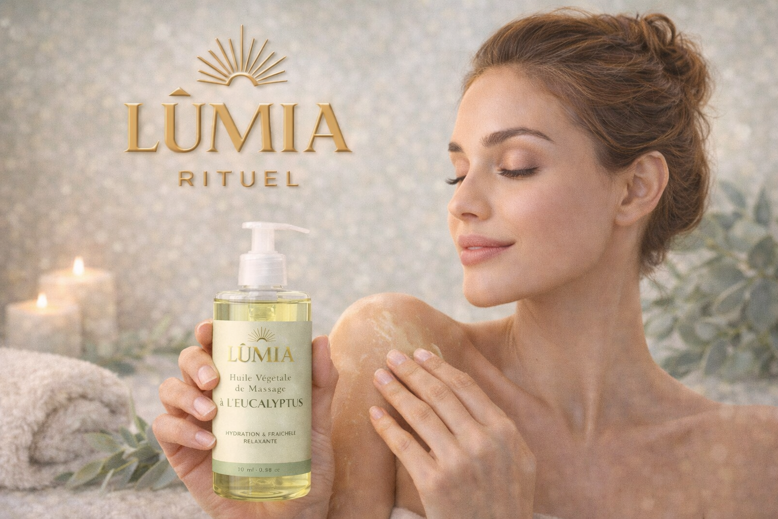 Huile Végétale de Massage à l’Eucalyptus LUMIA™ – Hydratation & Fraîcheur Relaxante